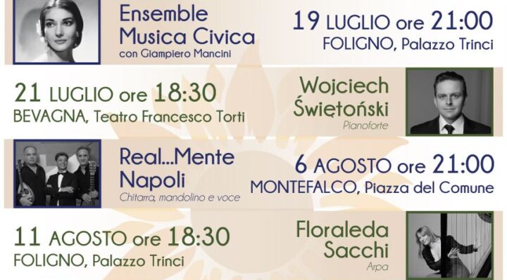 Vissi d’Arte. Vissi per Maria è il titolo del concerto del 19 luglio alle ore 21:00 che si terrà a Palazzo Trinci di Foligno. Lo spettacolo è un omaggio alla grande soprano Maria Callas ed anticipa i festeggiamenti per i cento anni dalla sua nascita. Verrà utilizzato un sofisticato impianto di amplificazione che permetterà di ascoltare la voce originale di Maria Callas, accompagnata in diretta dal violino del M° Dino De Palma, dal violoncello del M° Luciano Tarantino, dal pianoforte del M° Donato Della Vista e dalle parole dell’attore Giampiero Mancini.