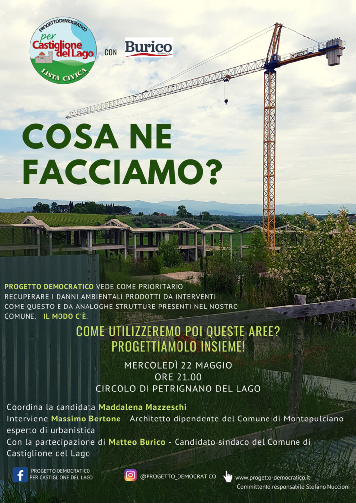 Proseguono gli incontri delle liste nel capoluogo e nelle frazioni del territorio. Progetto Democratico domani alle ore 21 sarà al Circolo Arci di Sanfatucchio per parlare con i cittadini di valorizzazione delle frazioni, beni comuni e sviluppo inclusivo; mercoledì 22 alle 21 al Circolo di Petrignano iniziativa “Cosa ne facciamo?”. «Progetto Democratico vede come prioritario recuperare i danni ambientali prodotti da interventi come quello di Petrignano e altri analoghi presenti nel territorio. Come utilizzeremo poi queste aree? Progettiamolo insieme». Coordina l’incontro la candidata al Consiglio comunale Maddalena Mazzeschi con l’intervento dell’arch. Massimo Bertone e la partecipazione di Matteo Burico.