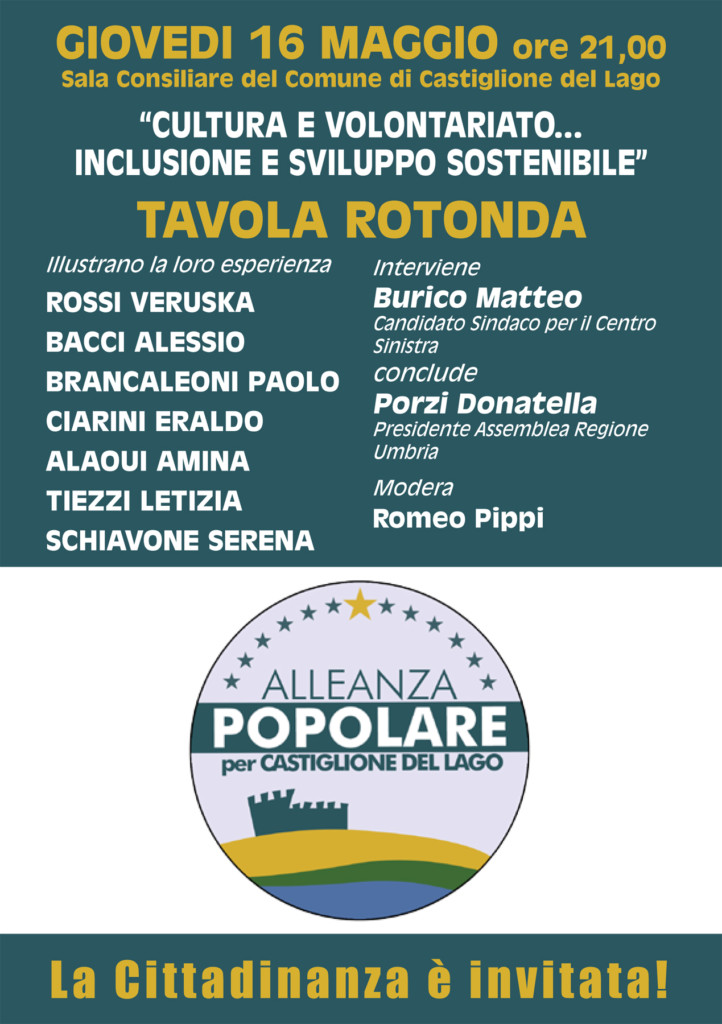 “Cultura e volontariato, inclusione e sviluppo sostenibile” è il titolo della tavola rotonda che si terrà questa sera alle 21, organizzata dalla lista “Alleanza Popolare per Castiglione del Lago” nella sala consiliare del Municipio.