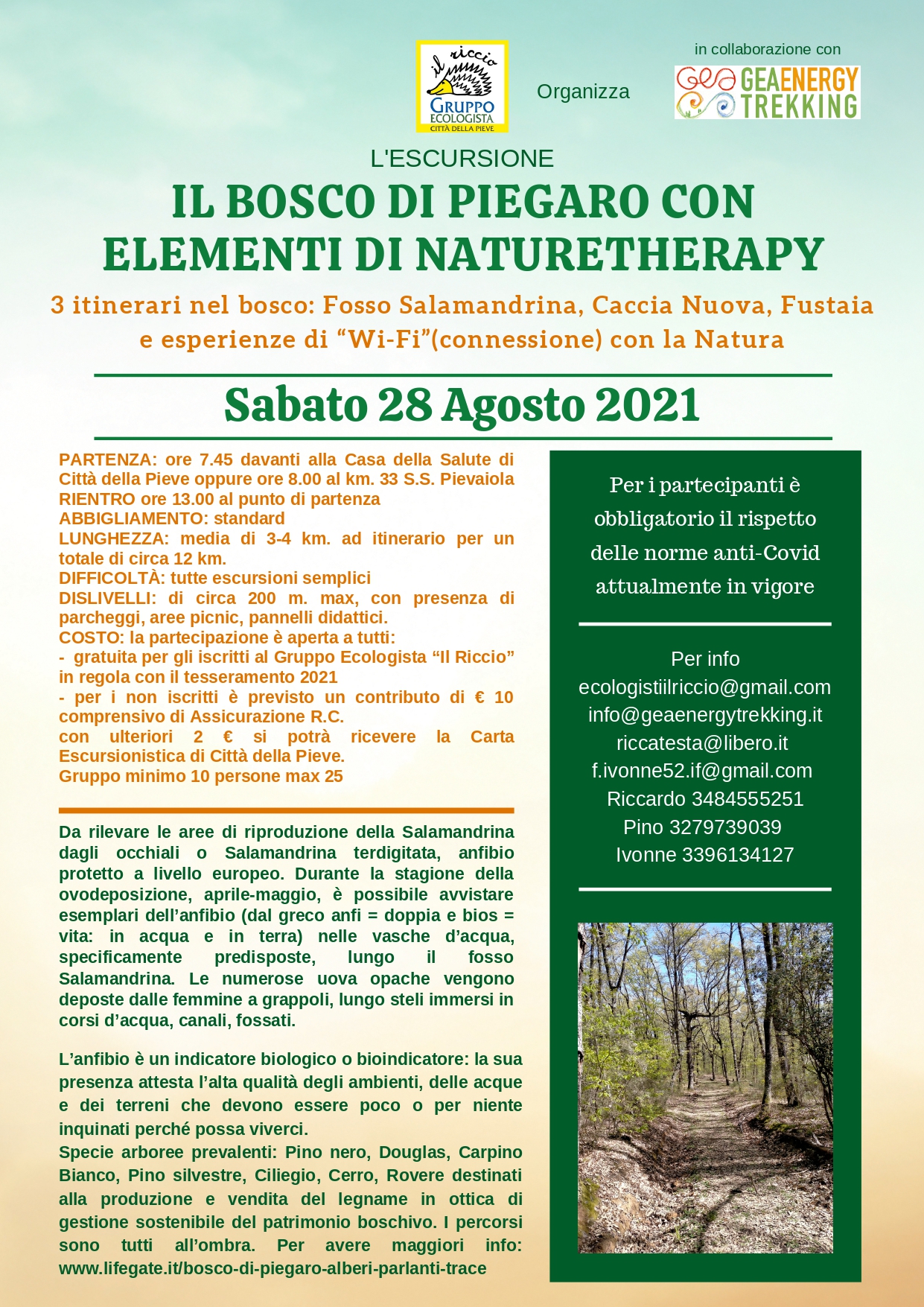 Il Gruppo Ecologista “Il Riccio” di Città della Pieve organizza per sabato 28 Agosto 2021, in collaborazione con GeoEnergyTrekking, l’escursione al Bosco di Piegaro arricchita da elementi di NatureTherapy.