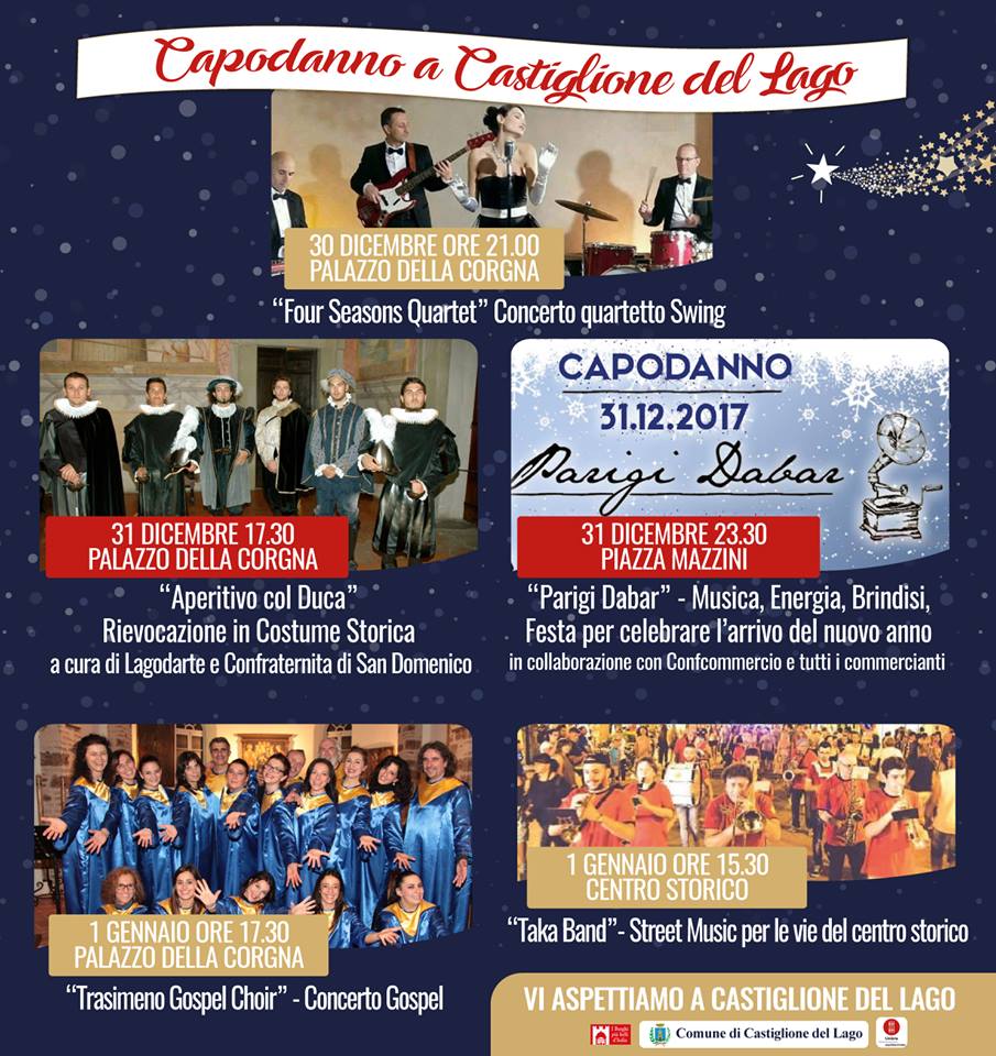 A Capodanno dalle 15:30 la “Taka Band Street Music” per le vie del centro storico, mentre alle 17:30 a Palazzo della Corgna Concerto Gospel con la “Trasimeno Gospel Choir“, il più attivo e importante coro di musica nero-americana dell’Umbria. Nato a margine del Trasimeno Blues Festival nel 2007 per iniziativa della cantante afroamericana Crystal White, che ha avuto un’importante carriera artistica in Italia sin dagli anni ’80, è stato da lei diretto per alcuni anni. Dal 2011 il coro è diretto dal pianista e cantante Mario Donatone, storico musicista dell’area romana assai apprezzato nel circuito blues e jazz nazionale.