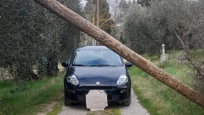 Il palo telefonico, caduto su un olivo, rappresenta una situazione di pericolo. Nonostante la gravità della situazione, l’azienda ha evitato di coinvolgere i Vigili del Fuoco per non interrompere il servizio telefonico agli abitanti del borgo, tra cui diversi anziani.