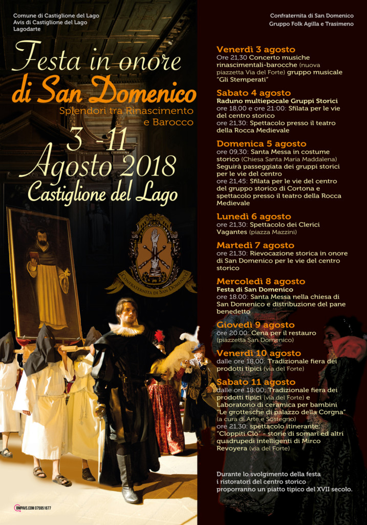 Dal 3 all’11 agosto 2018 Castiglione del Lago vedrà quindi diversi e importanti eventi coronare la Festa di San Domenico, tutti accompagnati dalla sensibilità, dalla buona volontà e dall’appoggio dei singoli cittadini e delle varie associazioni paesane, a sostegno di un percorso cominciato ormai tanti anni fa. Si inizia con “Raduno multiepocale dei Gruppi Storici” con rappresentanti provenienti da diverse parti d’Italia che arricchiranno le serate dal 4 al 6 agosto, mentre il gruppo musicale de “Gli Stemperati”, giovani preziosi talenti, aprirà il 3 agosto i festeggiamenti con un concerto di musiche rinascimentali e barocche che si svolgerà nella nuova piazzetta di via del Forte, antistante al palazzo comunale “Ex-Scuole Elementari”.