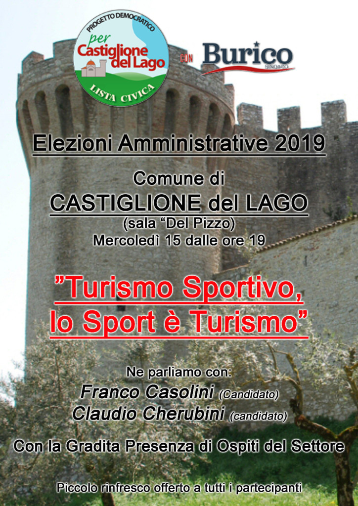 Lo sport nella sua accezione più ampia, dalle manifestazioni giovanili, all’evento agonistico di richiamo nazionale, inseriti in un’ottica di ampliamento dell’offerta turistica. “Turismo sportivo, lo sport è turismo” è il titolo dell’incontro di questa sera alle ore 19, presso la sala “Massimo Del Pizzo” di Palazzo della Corgna, promosso e organizzato da “Progetto Democratico“, lista in appoggio a Matteo Burico. Parleranno dell’argomento i candidati al Consiglio comunale Franco Casolini e Claudio Cherubini ed esperti operatori in campo sportivo. L’incontro si terrà nella Sala alle ore 19: un piccolo rinfresco sarà offerto a tutti i partecipanti.