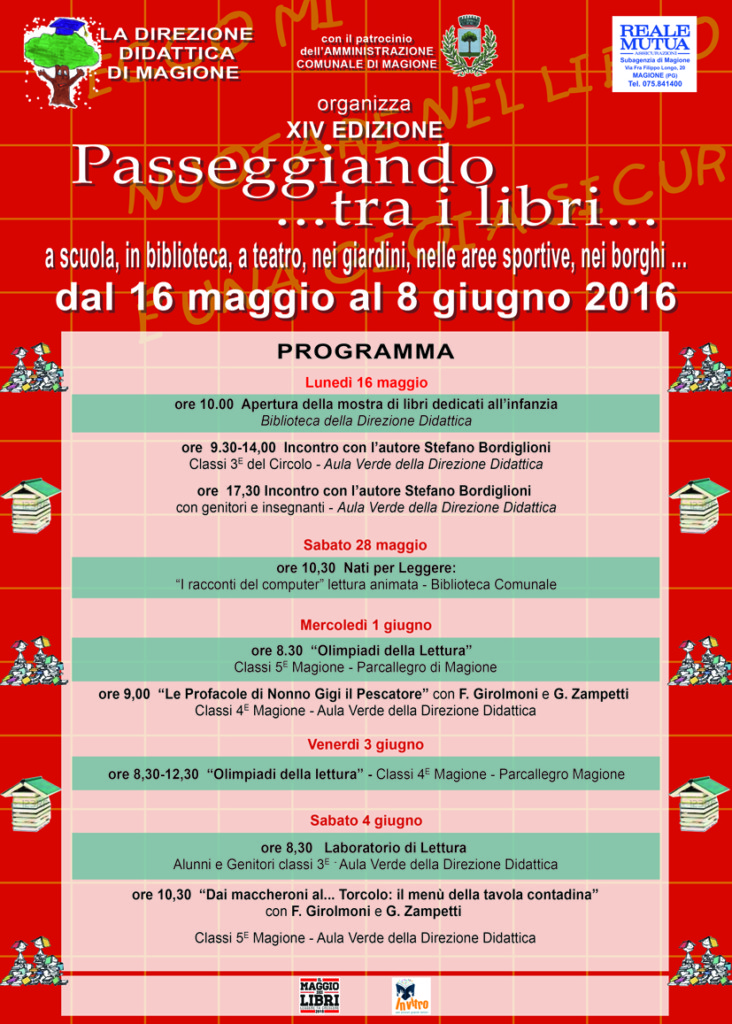 In occasione del Maggio dei libri il Circolo didattico di Magione organizza l’iniziativa Passeggiando tra i libri che, fino all’8 giugno, propone mostre, letture, giochi, laboratori in diverse realtà del territorio comunale in collaborazione con la biblioteca comunale, Nati per leggere e il progetto in vitro. Per il più piccoli, presso la biblioteca comunale, si terrà sabato 28 maggio, alle 10.30, la lettura animata de “I racconti al computer”.