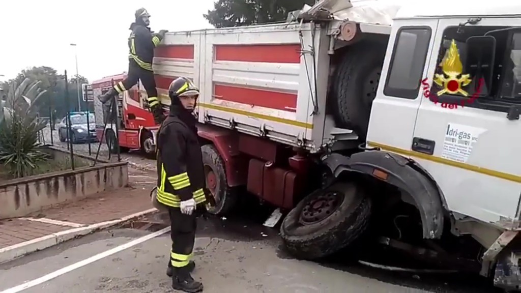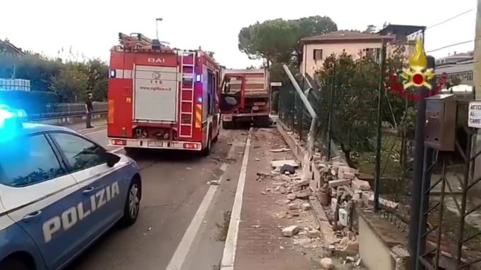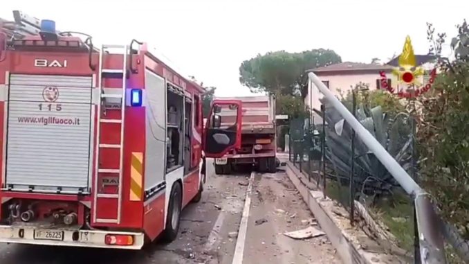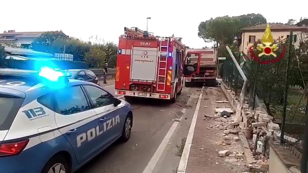 Nel video, infatti, si vedono tutte e due le ruote anteriori collassate. Da lì il camion è finito sul muro di cinta della recinzione di una casa. Stando a quanto riferiscono alla centrale di Madonna Alta, il mezzo, nell’incidente, ha subito un danno al serbatoio conseguente perdita di gasolio sulla strada Pievaiola. Sul posto, per valutare eventuali danni ambientali, sono arrivati anche i tecnici dell’Arpa, dell’Agenzia regionale per l’ambiente.