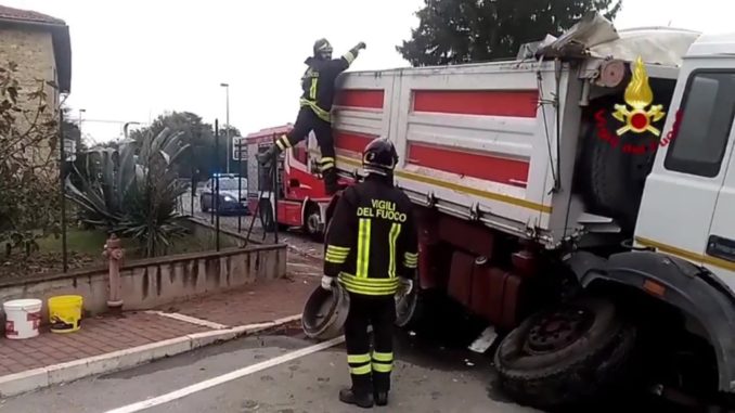 Il mezzo, sulla base di quanto si riesce a capire, ha avuto una seria avaria. “Ha fatto da solo – dicono i Vigili del fuoco -, sembra che abbia ceduto l’assale davanti”.
