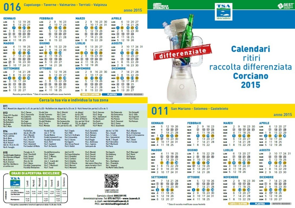 La TSA (Trasimeno Servizi Ambientali) anche quest’anno invierà agli oltre 42.000 utenti del proprio territorio, i calendari della raccolta differenziata, sempre divisi zona per zona, con tutte le informazioni sui giorni del ritiro dei vari rifiuti. È importante sapere che durante le festività, TSA può effettuare variazioni rispetto ai giorni di passaggio previsti per lo svuotamento dei contenitori della raccolta “porta a porta”. Ed è per questo che è utile per i cittadini dei nove Comuni serviti dal servizio “porta a porta” (Castiglione del Lago, Città della Pieve, Corciano, Magione, Paciano, Panicale, Passignano, Piegaro e Tuoro) consultare i nuovi calendari 2015.