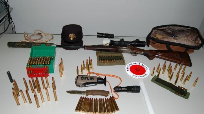 I militari hanno notato che uno di loro aveva un visore termico e pertanto hanno proceduto ad un controllo più approfondito eseguendo la perquisizione personale e del veicolo, rinvenendo e sequestrando una carabina con ottica di precisione e silenziatore, numerosi proiettili, una torcia ad alta potenza con attacco applicabile all’arma, un coltello sporco di sangue nonché attrezzature varie per il trasporto di animali uccisi.