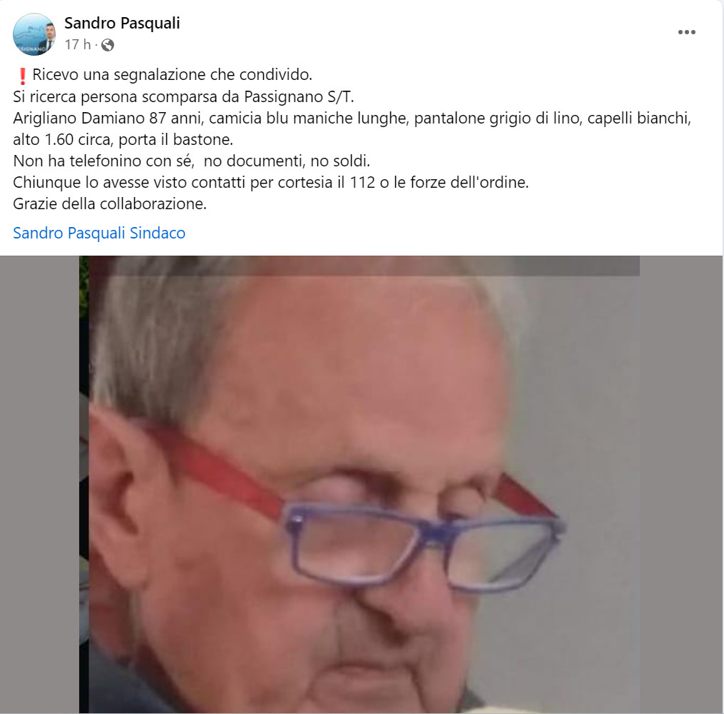Si ricerca persona scomparsa da Passignano sul Trasimeno. “Damiano Arigliano, 87 anni, camicia blu maniche lunghe, pantalone grigio di lino, capelli bianchi, alto 1.60 circa, porta il bastone. Non ha telefonino con sé, né documenti, né soldi. Chiunque lo avesse visto contatti per cortesia il 112 o le forze dell’ordine”. E’ quanto afferma Sandro Pasquali, sindaco di Passignano sul Trasimeno, attraverso un post su Facebook. https://www.facebook.com/share/p/8zX6xBAiHZCU1HaJ/
