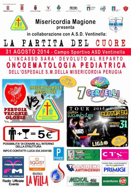 Manca poco, o forse pochissimo per il pomeriggio di beneficenza che si svolgerà domenica 31 a Soccorso di Magione, presso il campo Comunale Lamberto Ragni, un pomeriggio che sarà all’assoluta insegna del far bene al prossimo ed in questo caso ai bambini. “Sarà una giornata molta impegnativa – racconta Luca Sordi consigliere della Misericordia di Magione, organizzatrice insieme al Ventinella Calcio – e i cui frutti saranno destinati all’acquisto di C-Pap (un respiratore polmonare) da donare al reparto di Oncoematologia Pediatrica dell’Ospedale Silvestrini. Si comincerà dalle ore 18.00, quando scenderanno in campo le Vecchie Glorie del Perugia e il gruppo sportivo della Misericordia di Magione, ci saranno tanti nomi noti, a partire da Boranga, passando per Ze Maria, Vannini, Malizia, Vinti, Lupini, e Ceccarini, inoltre siamo ancora in attesa di sapere altri nomi. Ma non solo loro, parteciperanno all’evento anche gli attuali Grifoni Taddei e Falcinelli, mentre la special guest di tutta la giornata sarà Marco Bocci”.