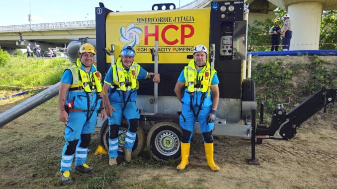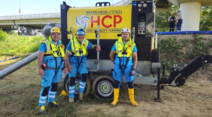 Filippo Rigucci, responsabile del settore Protezione civile della Misericordia di Magione, e i volontari Croitoriu Dumitru e Sauro Ragni hanno così potuto acquisire le competenze necessarie per poter utilizzare il modulo High Capacity Pumping – Hcp, innovativo sistema scomponibile di idrovore in dotazione al Sistema nazionale di protezione civile delle Misericordie d’Italia. Il mezzo consente di pompare e trasportare fino a un milione di litri di acqua all’ora ad oltre un chilometro di distanza dal luogo di intervento, per la gestione sono stati impegnati circa cinquanta volontari.