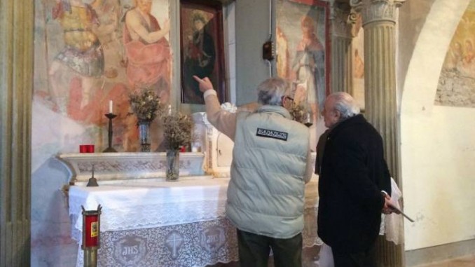 MAGIONE 20 febbraio 2015 – Sopralluogo nei giorni scorsi del rettore dell’Università degli studi di Perugia, Franco Moriconi, ad alcune proprietà che l’ente possiede al Trasimeno nell’area di Magione. Dopo l’ispezione alla sede distaccata dell’istituto idrobiologico di Monte del Lago, il rettore ha visitato la chiesa di Santa Maria d’Ancaelle a Sant’Arcangelo in qualità di presidente del Collegio della Sapienza ente proprietario dello storico edificio. A far da guida al rettore lo storico Gianfranco Cialini già curatore del fondo antico dell’Università di Perugia, tra i primi a studiare questo prezioso documento della storia dell’arte lacustre su incarico della stessa Università.