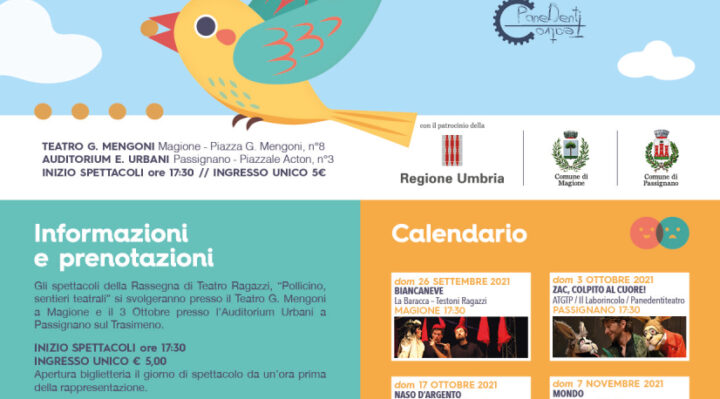 Sei appuntamenti, di cui il primo domenica 26 settembre, ore 17.30, compongono il cartellone della rassegna Pollicino sentieri teatrali organizzata dall’associazione Panedentiteatro e sostenuta dal Comune di Magione.