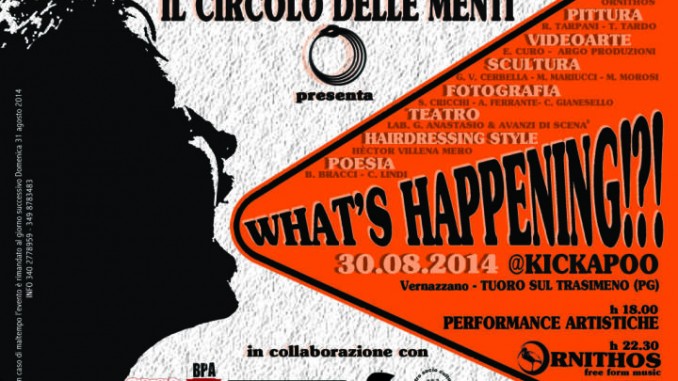 Sabato 30 agosto 2014 dalle ore 18.00 alle 01.00 al Circolo Kickapoo di Vernazzano (Tuoro sul Trasimeno) l’Associazione musicale ed artistico culturale Il Circolo delle Menti, in collaborazione con BPA Studio Prod., Laboratorio di Cinema Gabriele Anastasio, Associazione Argo e Centro socio culturale Castel del Piano, è lieta di presentare “WHAT’S HAPPENING!?!”, evento d’Arte Totale nel quale confluiranno Musica, Pittura, Scultura, Videoarte, Fotografia, Teatro, Hairdressing style e Poesia, un dialogo di energie creative e idee di sperimentazione condivisa.