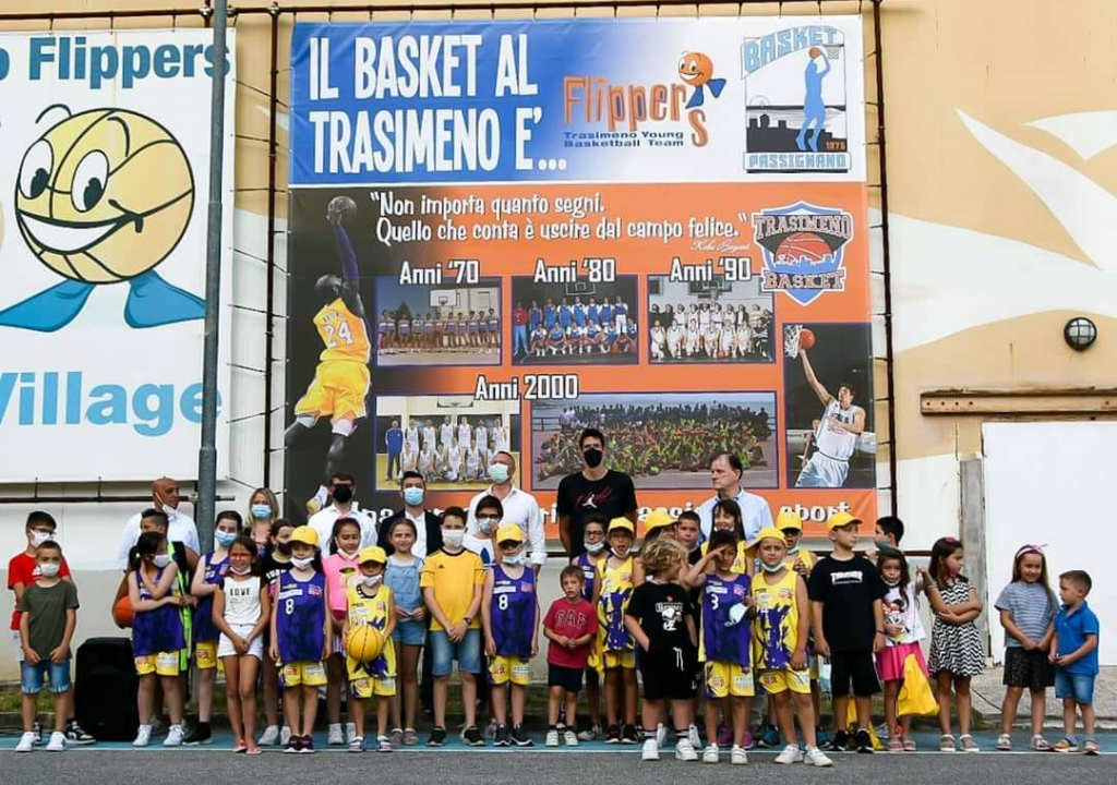 L’evento è culminato con l’inaugurazione della nuova tela permanente, installata sulla parete esterna dell’impianto che raffigura immagini di una lunga storia di passione e di sport delle due Associazioni, Basket Passignano e Trasimeno Flippers, accomunate dal nuovo logo Trasimeno Basket.