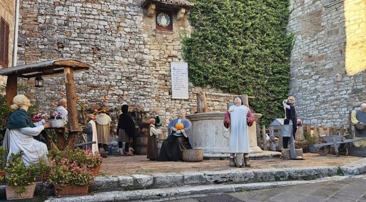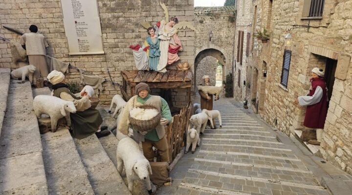 Il Presepe monumentale, uno dei principali punti di interesse della manifestazione, resta visibile h24 lungo l’acropoli di Corciano. Allestito da volontari della parrocchia, il presepe ripropone scene della Natività attraverso personaggi a grandezza naturale, con teste e mani in terracotta e costumi medievali. Ogni scena è ispirata ai versi del “Cantico delle Creature”, un invito alla riflessione sulla bellezza e sacralità della natura. Il presepe diventa così un cammino fisico e spirituale che accompagna i visitatori in una meditazione sul rispetto e la cura del creato.